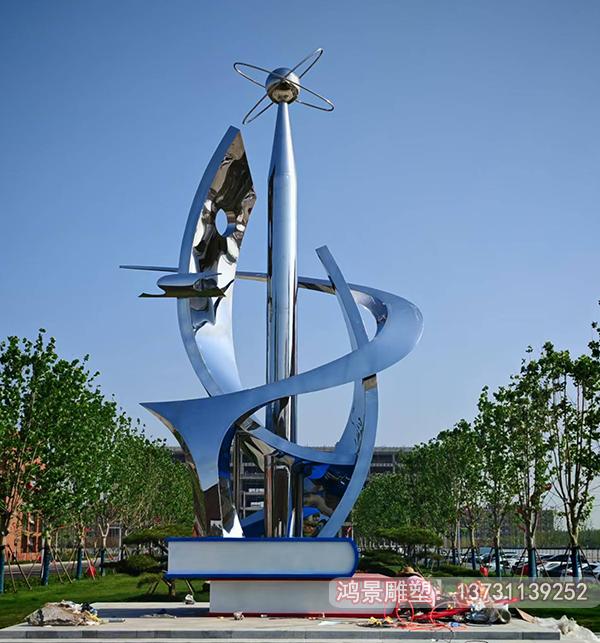 這座校園科技創(chuàng)新雕塑安裝于山東濱州職業(yè)科技學院,以現(xiàn)代簡約的不銹鋼材質打造,整體造型猶如一束躍動的智慧之光。主體采用鏡面拋光工藝的不銹鋼板,經過精密激光切割后形成錯落有致的幾何切面,在陽光下折射出璀璨的科技光芒。雕塑基座鑲嵌著;崭〉瘢捎没瘜W蝕刻工藝將校訓文字與齒輪、芯片等科技元素完美融合。