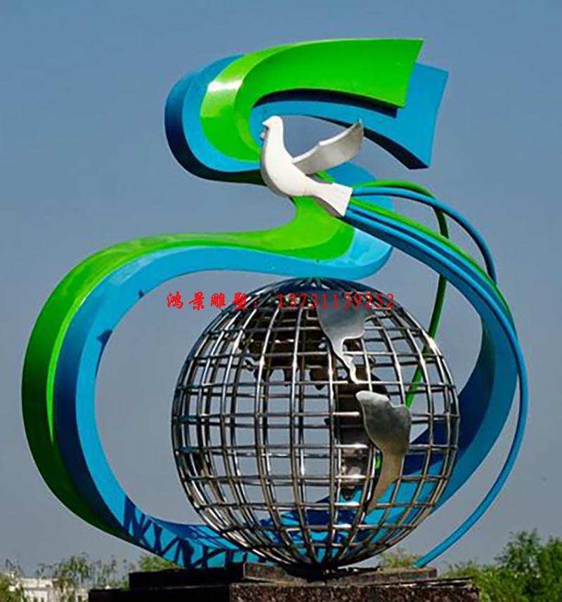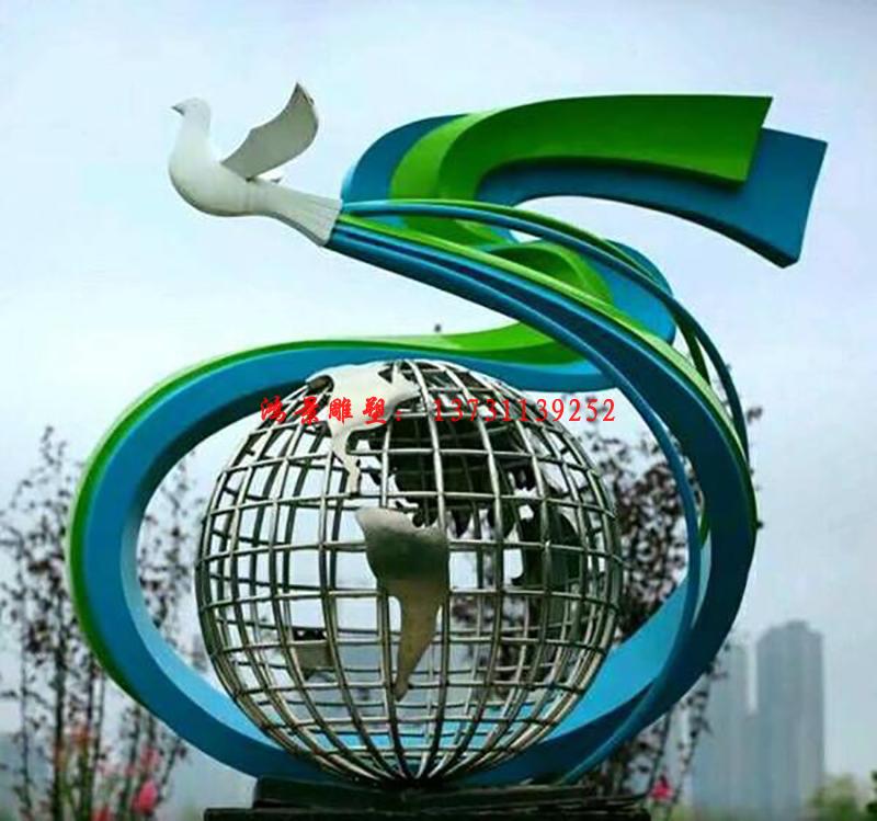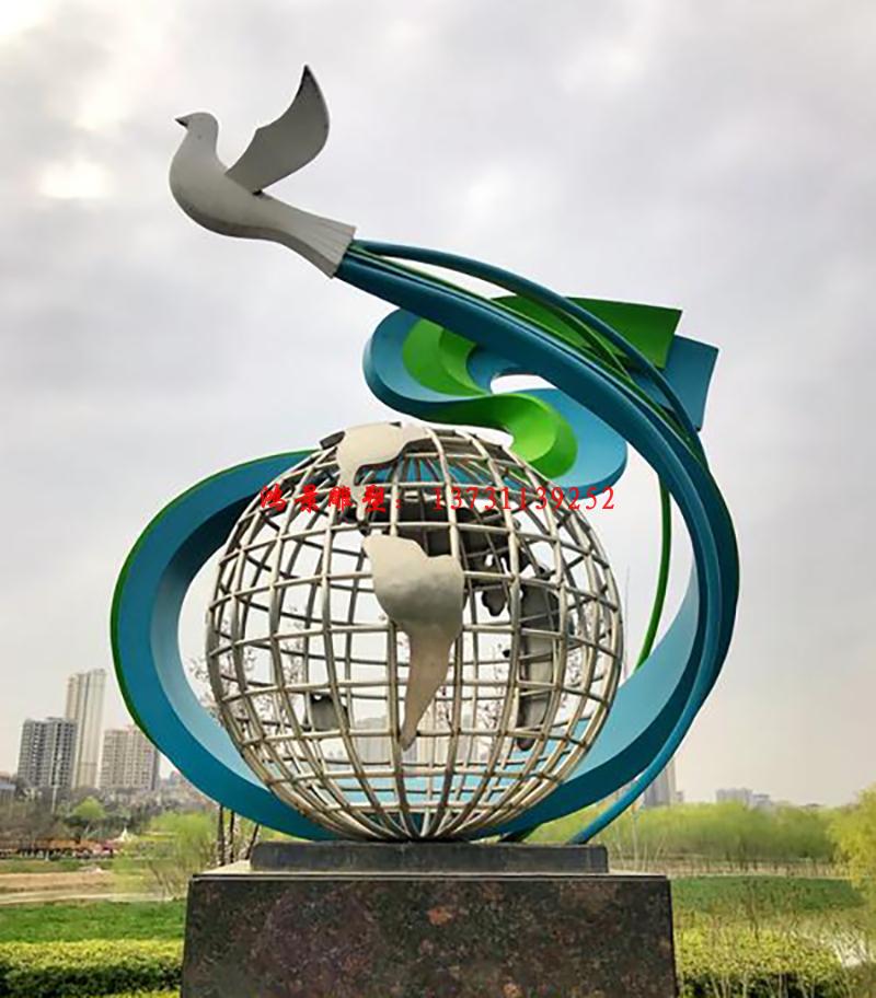 不銹鋼地球雕塑上面盤旋和平鴿