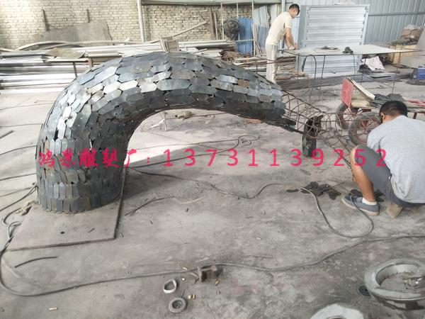 雕塑加工:內(nèi)部采用鋼筋骨架,外邊鑲不銹鋼板材,外表噴有仿銅漆